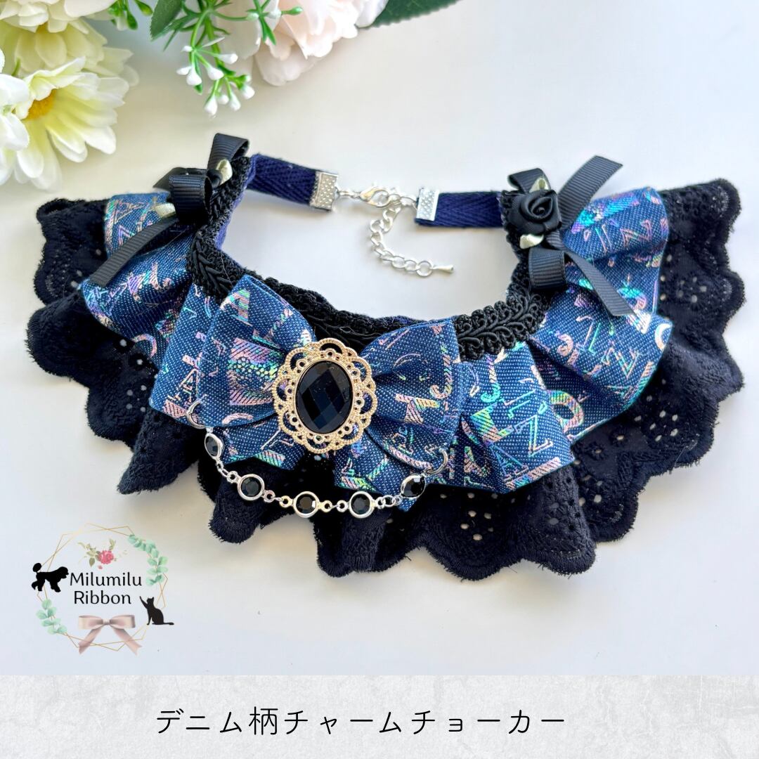 【チェーン付き♡チョーカー♡デニム】お散歩 派手すぎないちょっとしたお洒落に ペット用チョーカー 撮影用 ペット用 プレゼント ギフト イベント用 猫 犬 犬用チョーカー