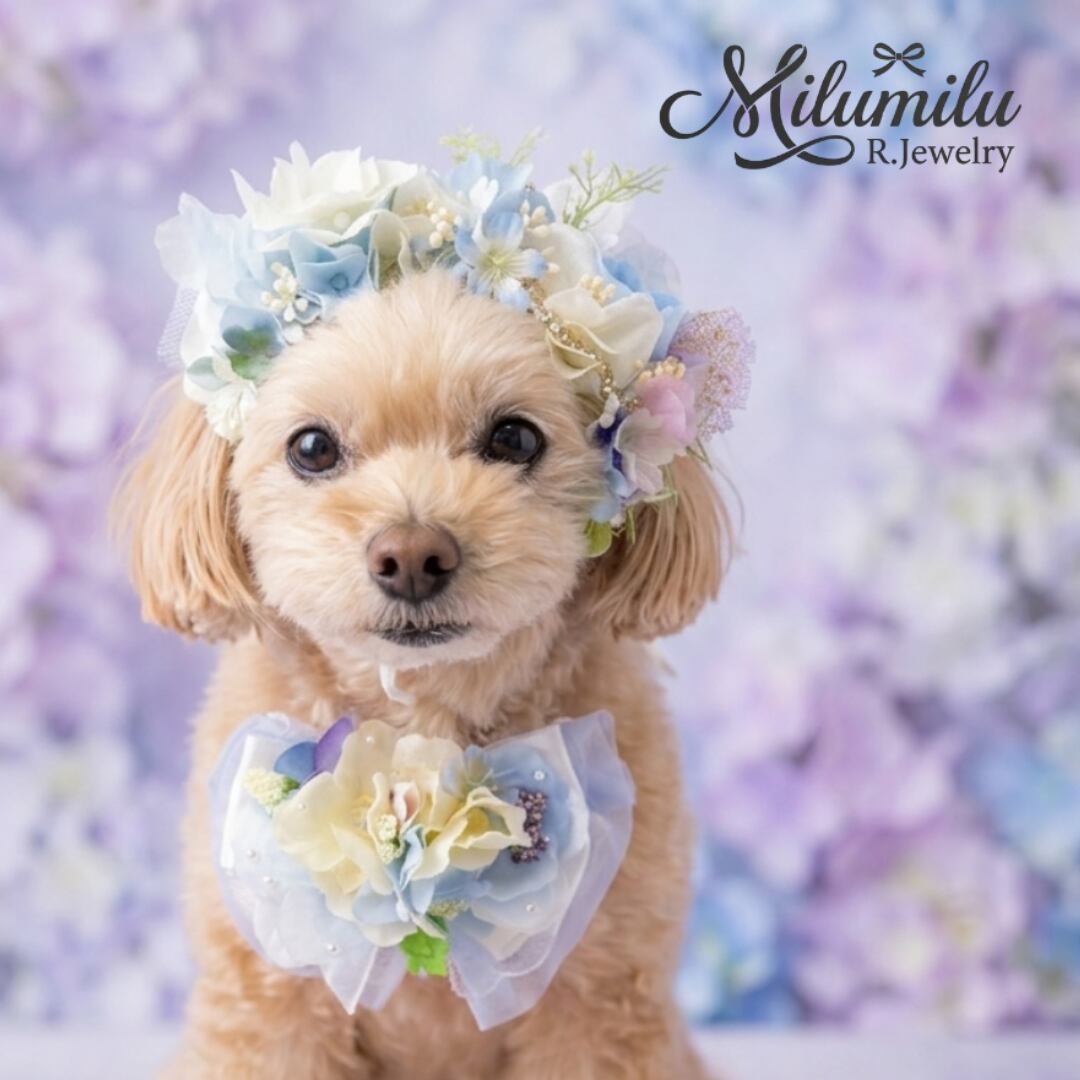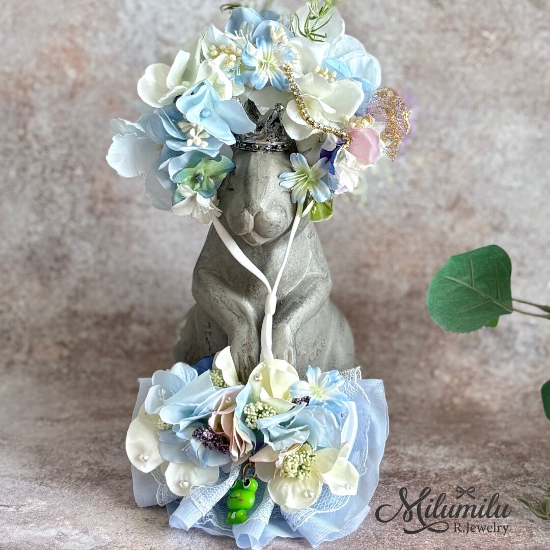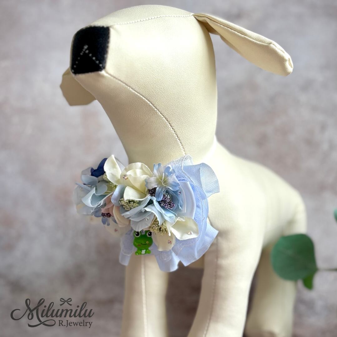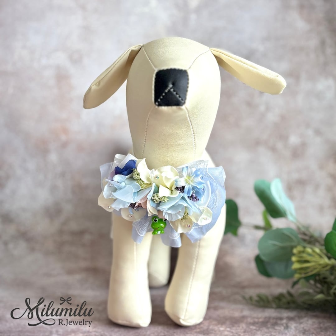 お散歩サイズ♡【雨上がりの雫と紫陽花チョーカー(蛙のチャーム付き)】紫陽花 雨の日のお洒落 撮影用 お誕生日 記念日 ペット用 プレゼント ギフト イベント用 猫 犬 犬用チョーカー