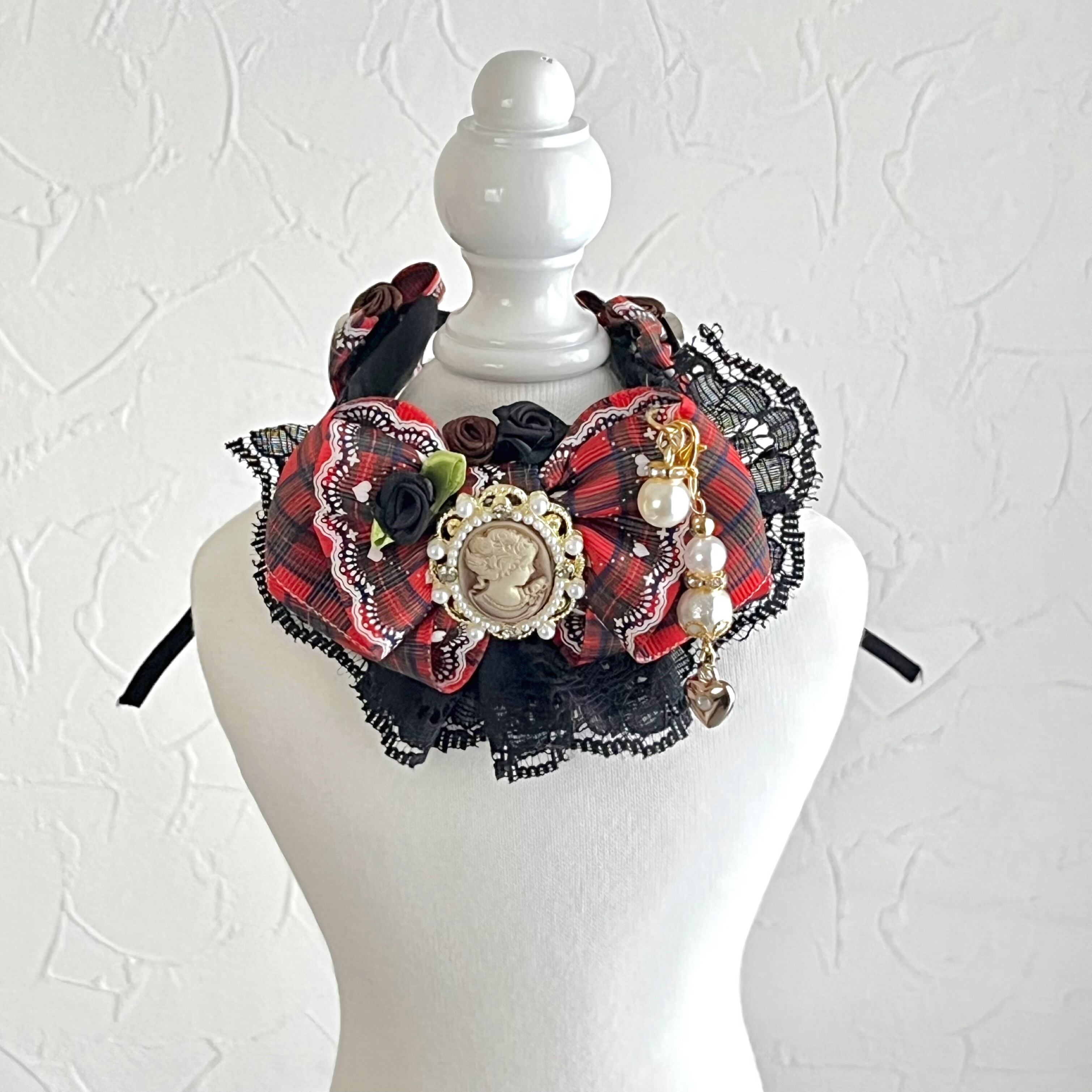 【ハートチェック柄♥新土台チョーカー】お首のサイズに合わせて調整可能 チャームは取り外してストラップに 撮影用 イベント ペット用