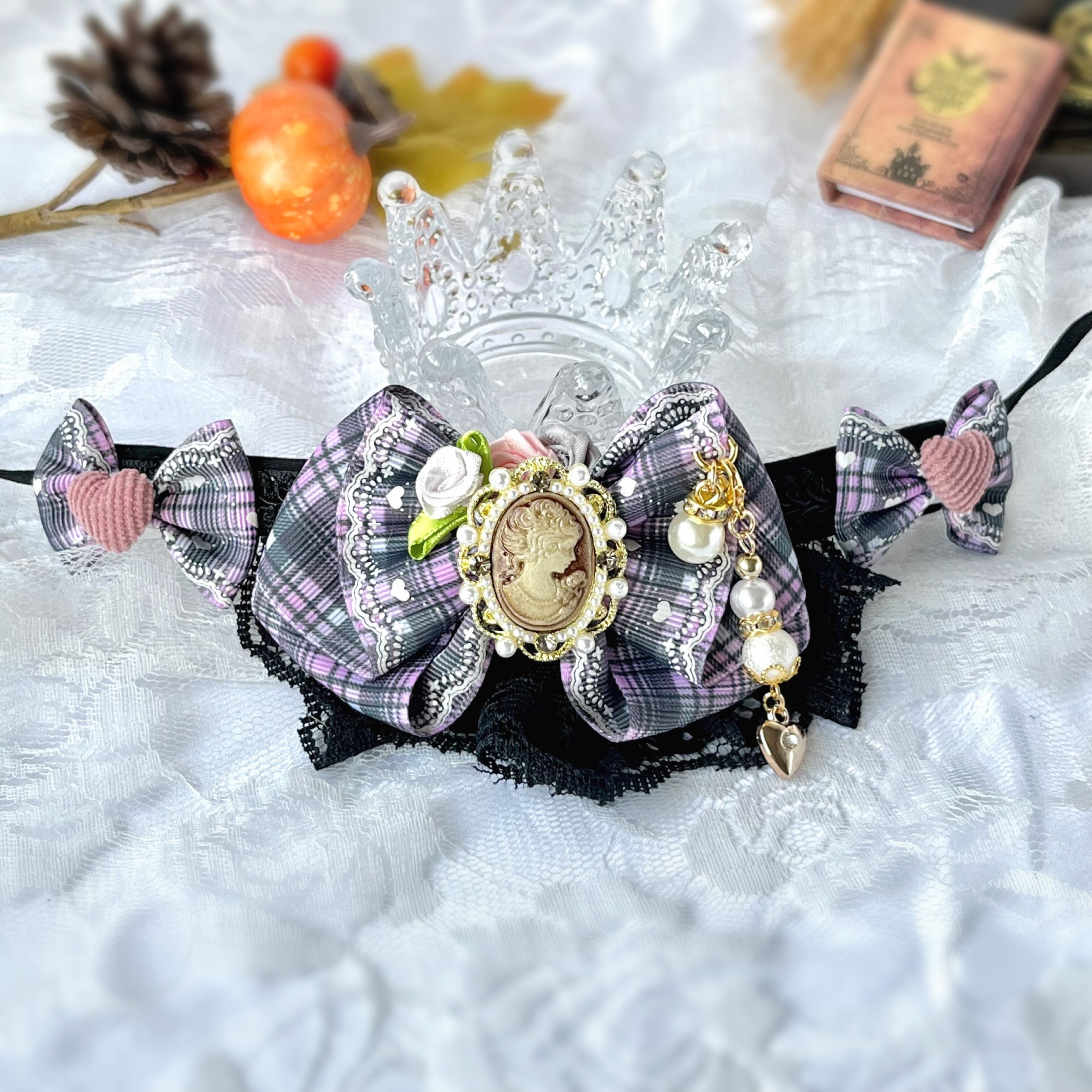 ハート柄のかわいいチェック柄新土台チョーカー