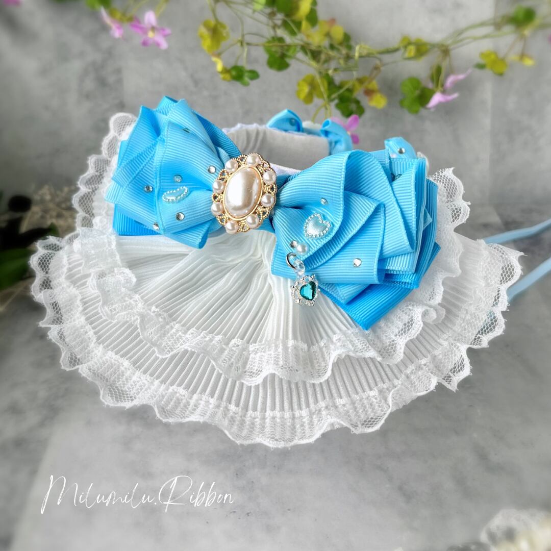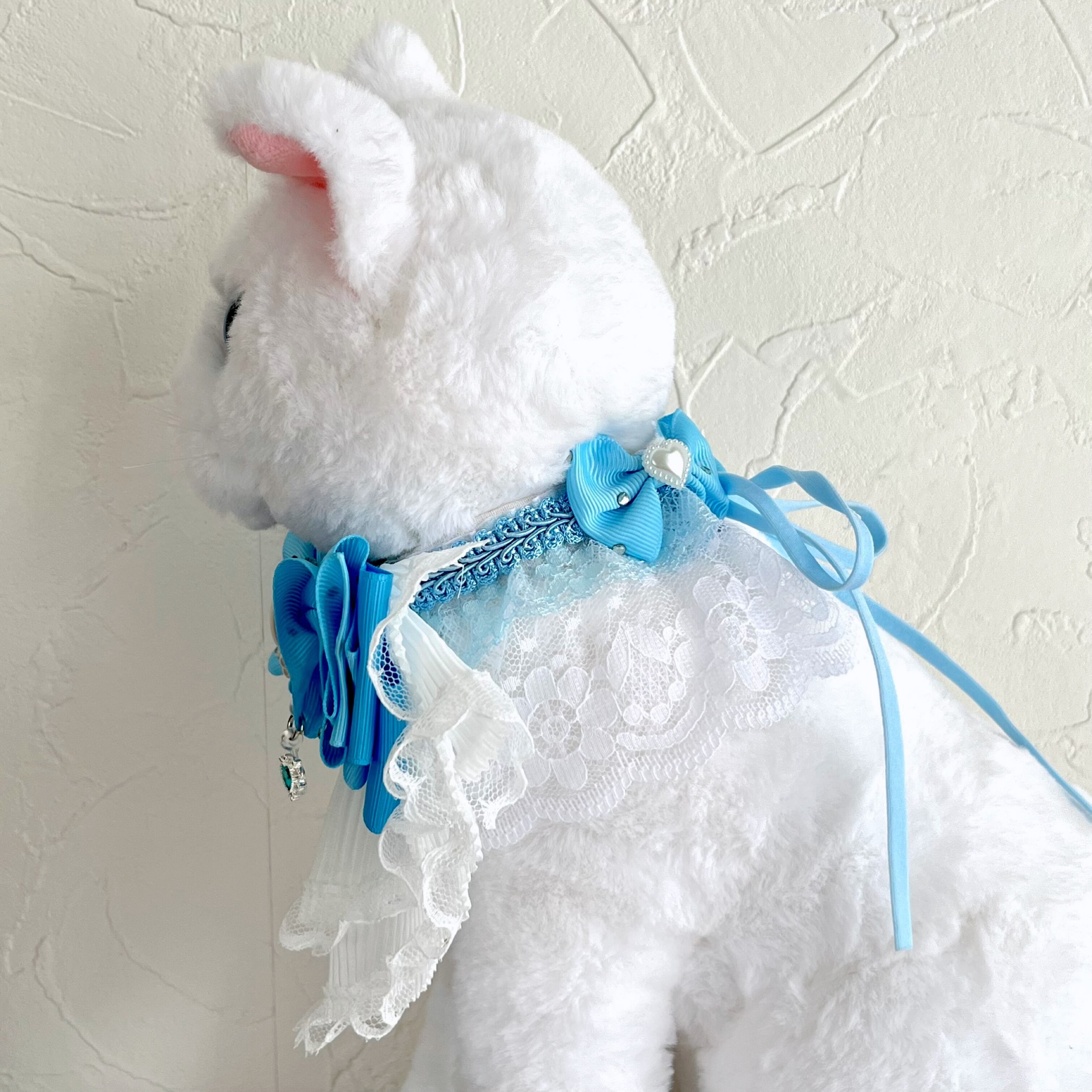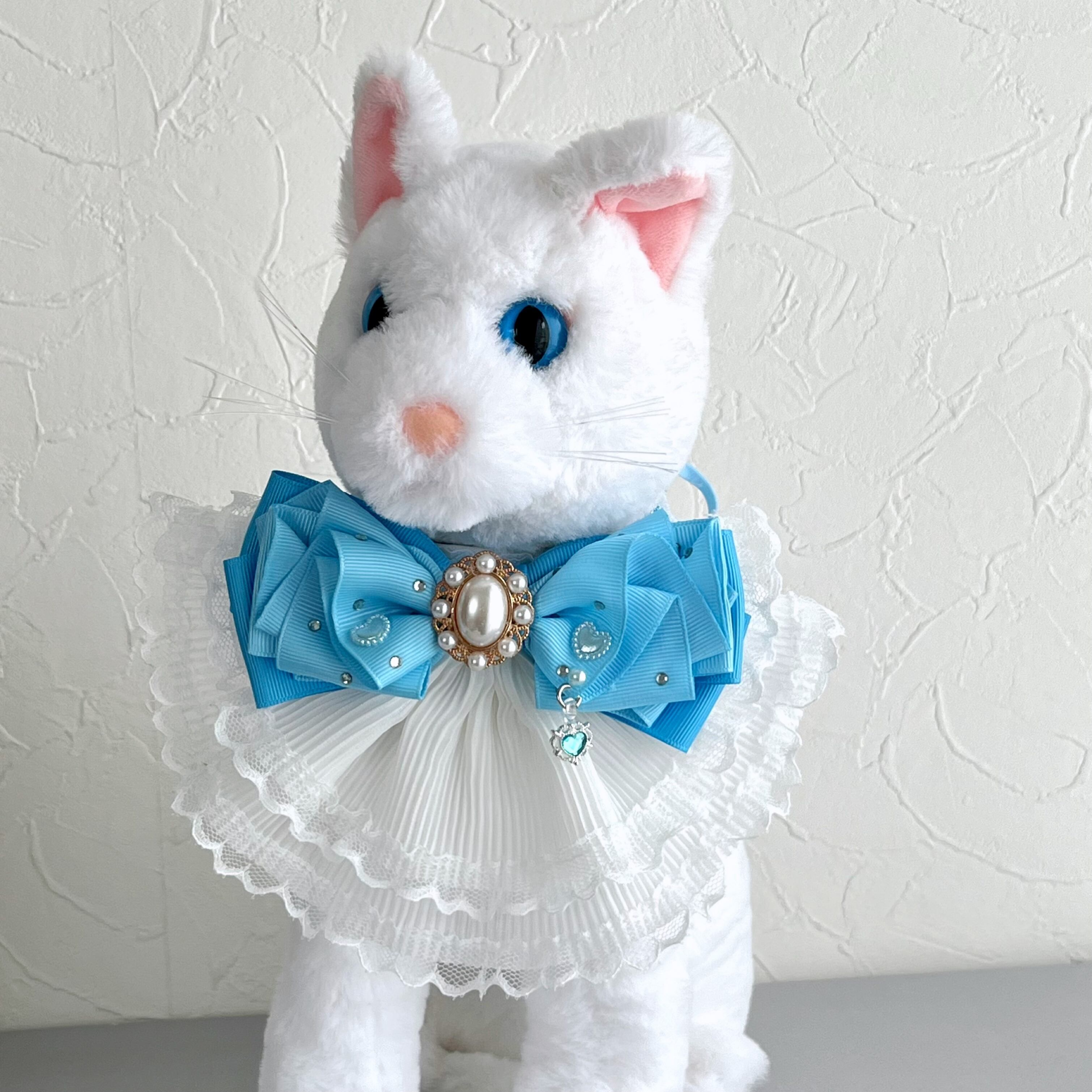 【上品でかわいいAqour ribbonチョーカー】スワロフスキー柄 お首のサイズに合わせて調整可能 横から見てもかわいいデザイン 撮影用 イベント お誕生日 プレゼントに ペット用