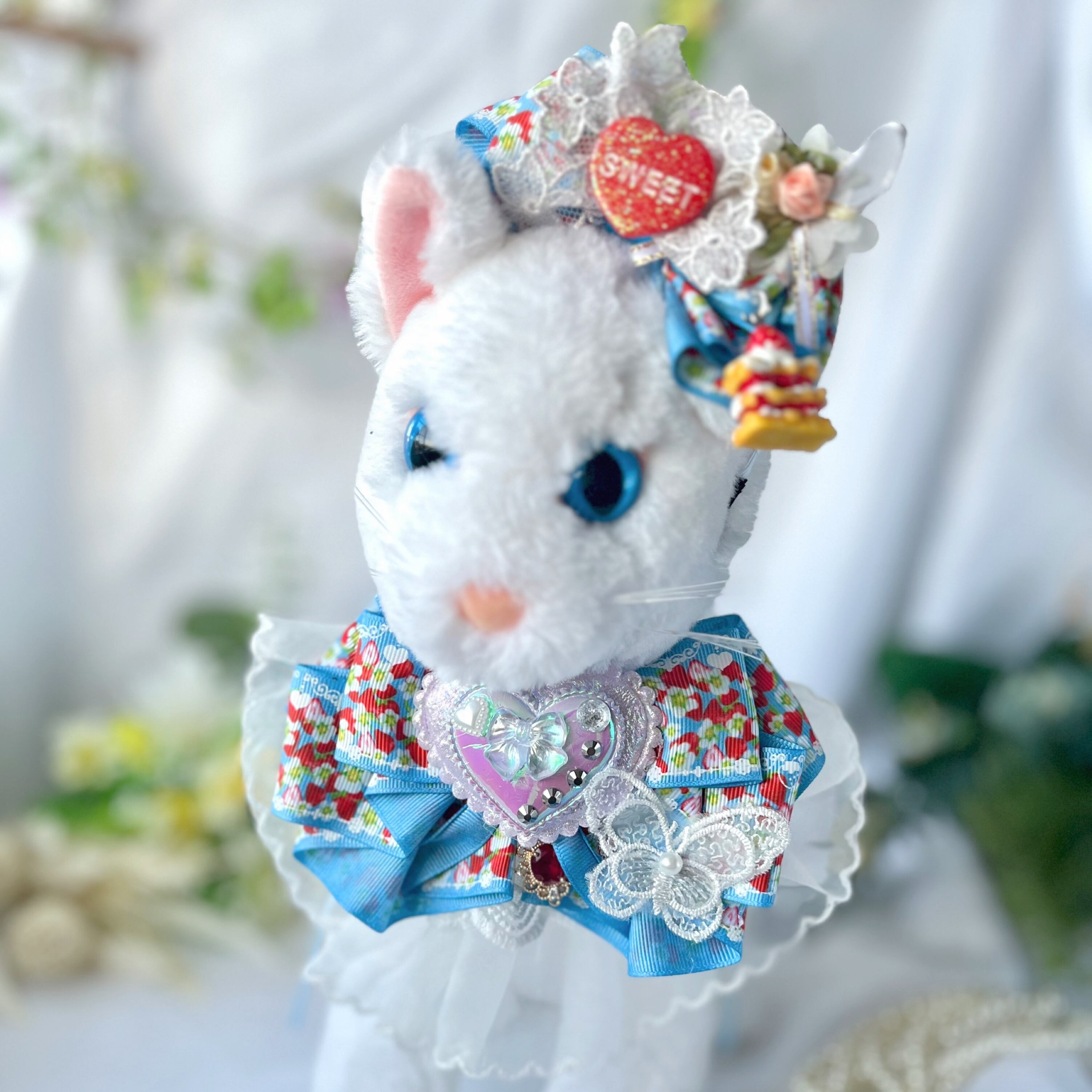 【苺デニムnohanaチョーカー】小さめ苺いっぱいぎっしり フリルたっぷり大きめチョーカー お散歩用 ペット用 プレゼント イベント用