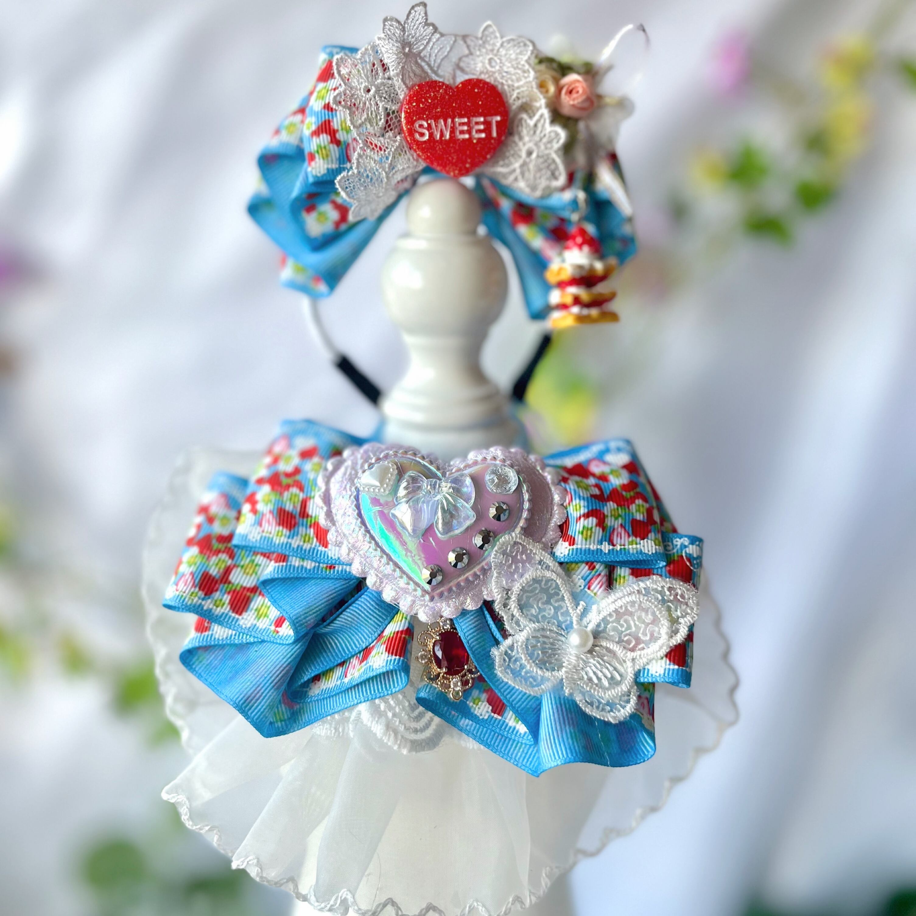 【デニム苺柄Leticiaカチューシャ】 小さめ苺いっぱいぎっしり 撮影用 ペット用 プレゼント