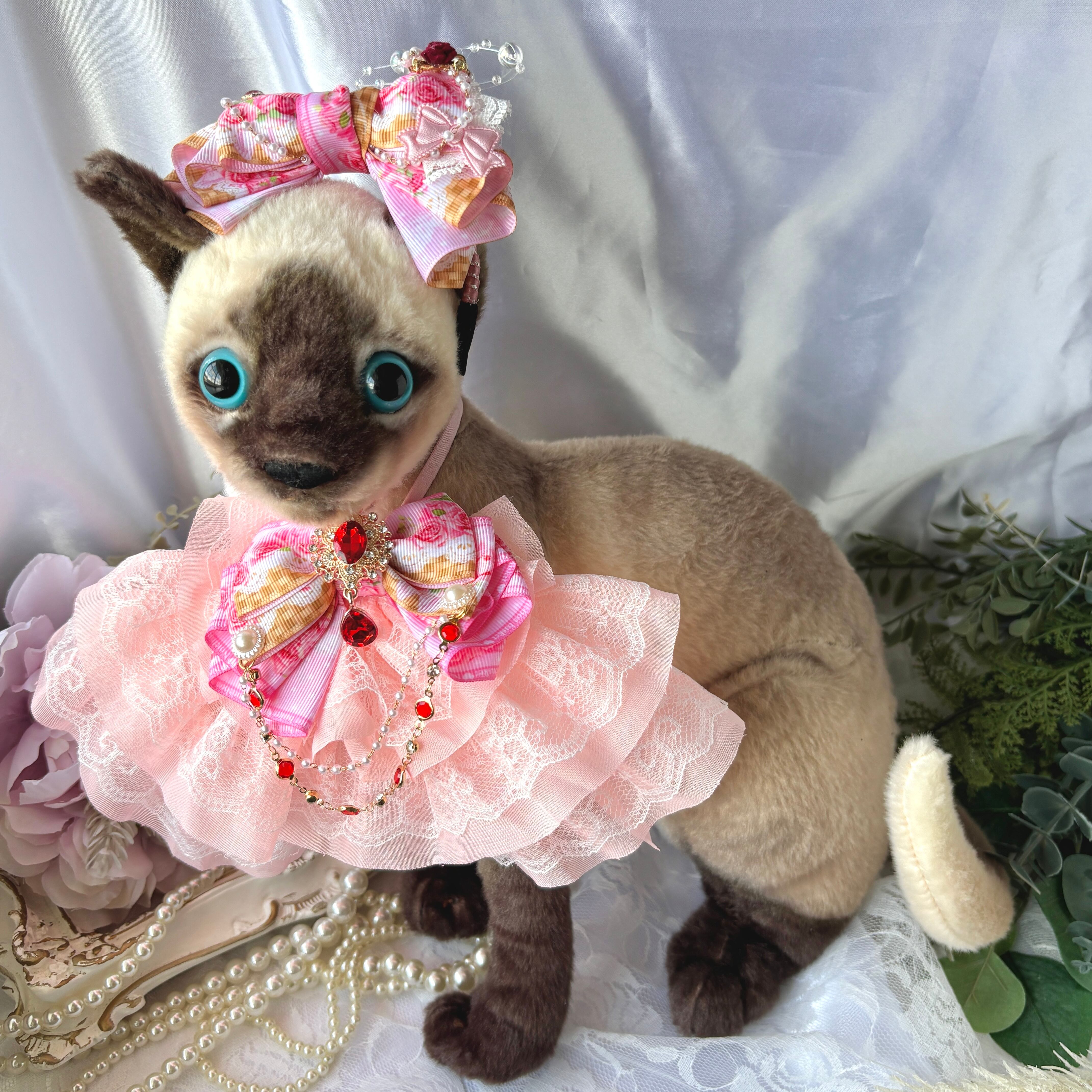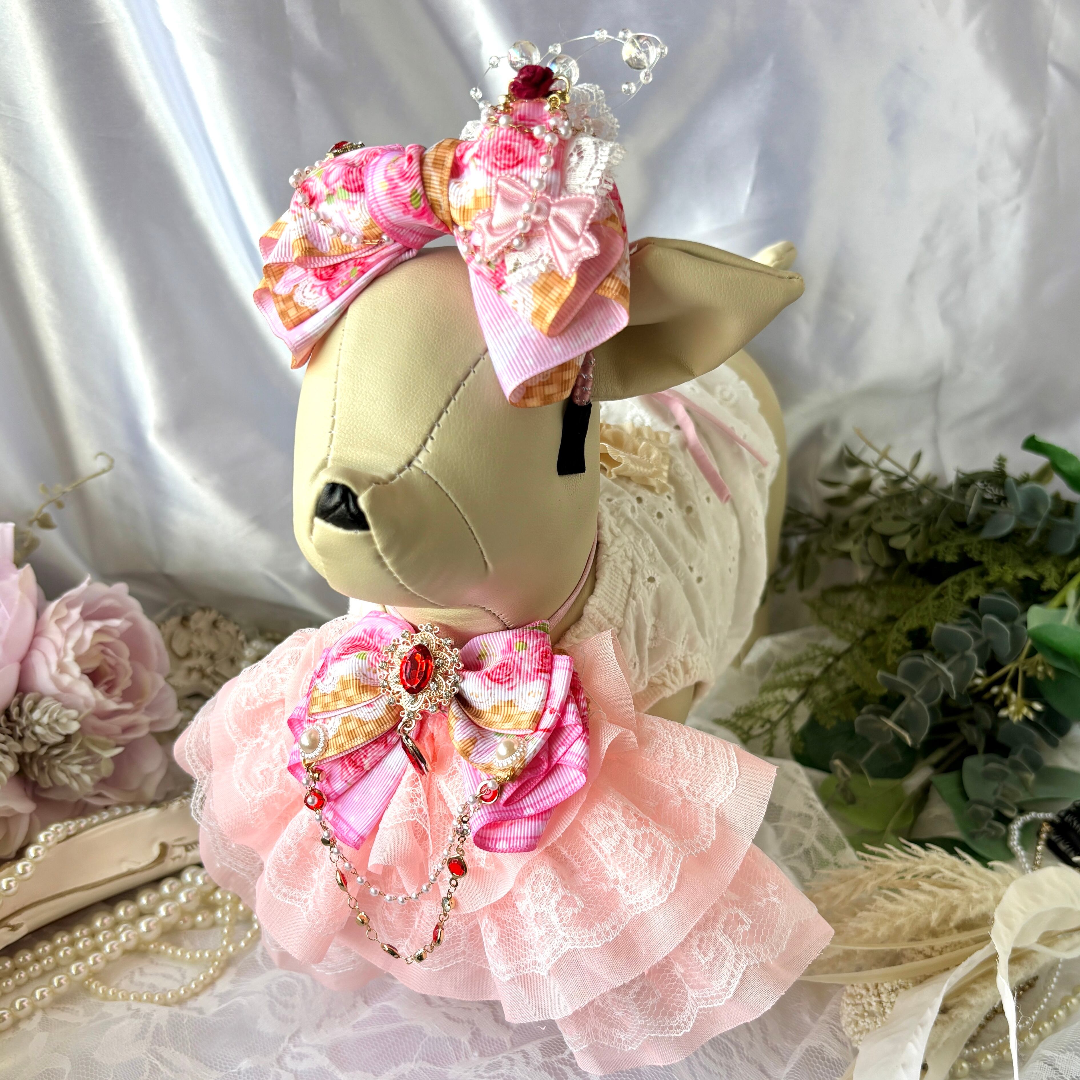 【薔薇柄アレンジメント籠リボン♡扇形チョーカー&カチューシャセット】ペット用 ギフト イベント 撮影用 ソフトゴム使用 犬 猫